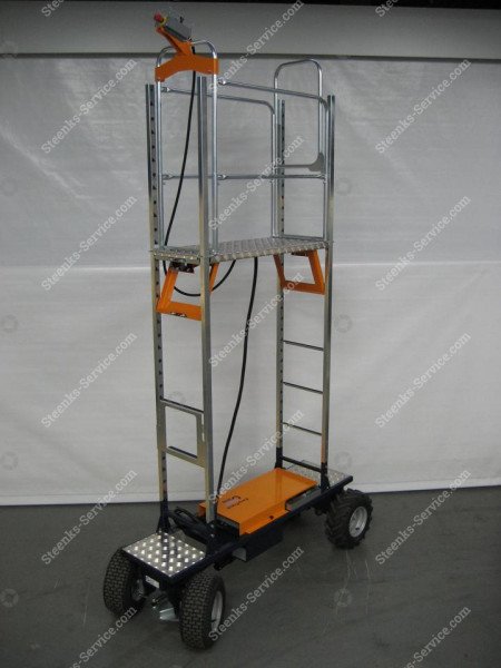 Luchtbandenwagen, Benomic easy track (BP0000255) 1x op voorraad Referentie: BP0000255 Minimale hoogte: 69 cm Maximale hoogte: 230 cm * plateau afmetingen (LxB): 116x44,5 cm. * rijsnelheid max 40 mtr. per min. * met 24V 159 Ah/20h tractie-accu * met accu-indicatie-meter * met 24 Volt elektromotor * met 4 luchtbanden * draaicirkel 500 cm. * plateau voorzien van 1 voetschakelaar * reling met 1 deur en afneembaar bedieningsconsole Steenks Service staat voor: - Groot assortiment nieuwe en gebruikte machines - Service, onderhoud en reparaties - 40 jaar ervaring - Eigen onderdelenmagazijn - Service op locatie Levering: Nieuwe en gebruikte machines binnen Nederland GRATIS GELEVERD! Vraag voor verzending van onderdelen en accessoires onze scherpe tarieven op. Garantie: Op al onze nieuwe machines krijgt u 1 jaar garantie. Op al onze gebruikte machines krijgt u 3 maanden garantie. Op alle gebruikte accu’s krijgt u het 1e jaar 50% en het 2e jaar 25% garantie. Kijk voor meer nieuwe en gebruikte machines op onze website: www.steenks-service.nl of bel +31 (0)174-510266.