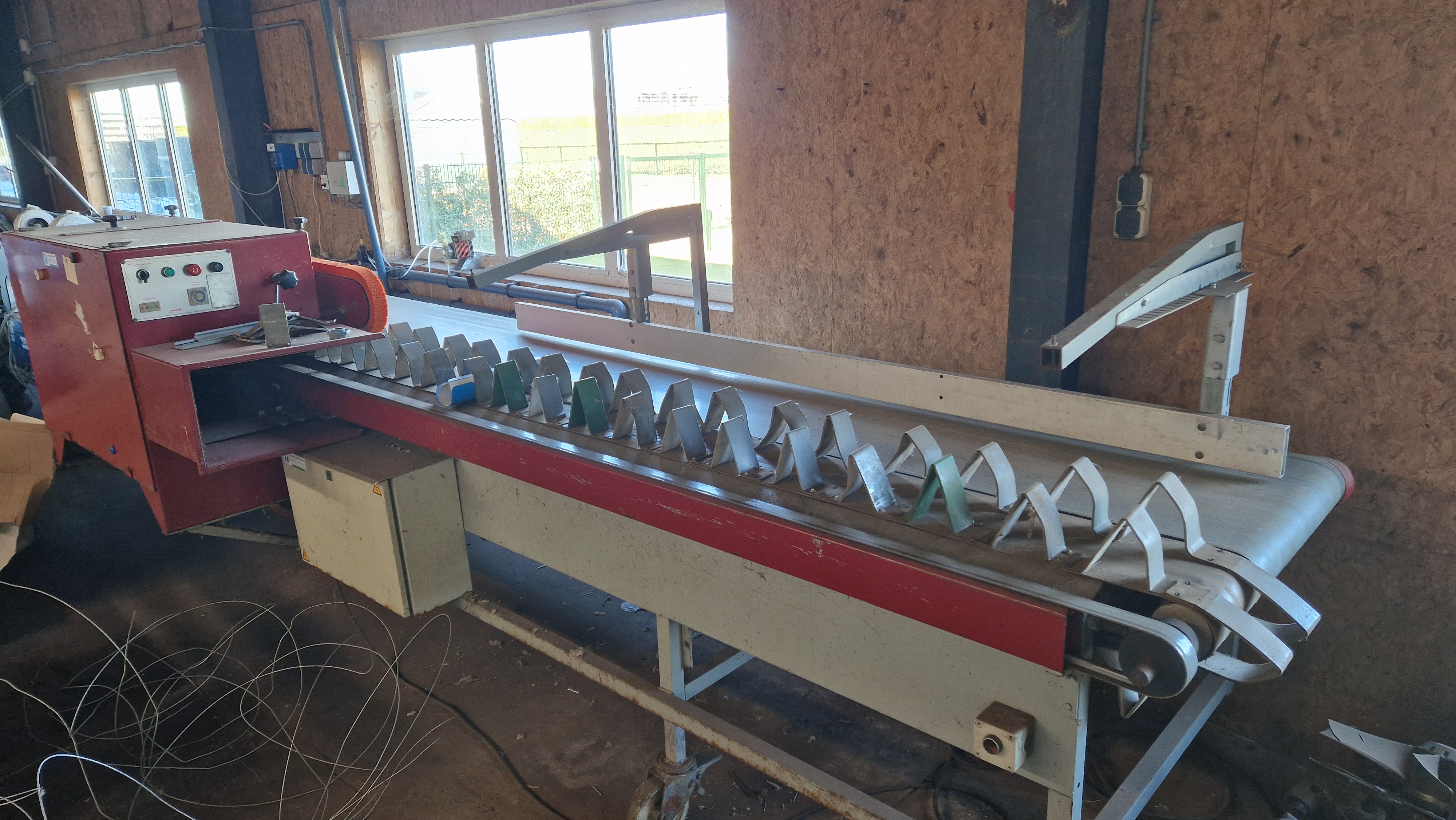 BTM Smits boslijn/bloemenverwerkingslijn, rechts naar links, 4mtr opleg, vakken, mes, 2x cyclop binder, 3mtr afleg, totaal ongeveer 9mtr