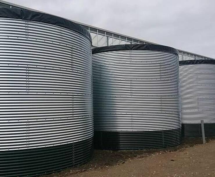 For sale: a new Buwatec watertank WSA extra heavy duty version.. 1336m3 capacity. Dimension is 20,94m x 3,88m high. 5 Rings of 23 galvanised plates. The bottom ring is factory-coated for extra protection Delivered with a new silo cover with all fastening materials and wall felt. Penetrations can also be made in the floor for, for example, an overflow or suction pipe. Allso available a Delafloat anti-algea floating cover . Pictures are examples of watertanks .