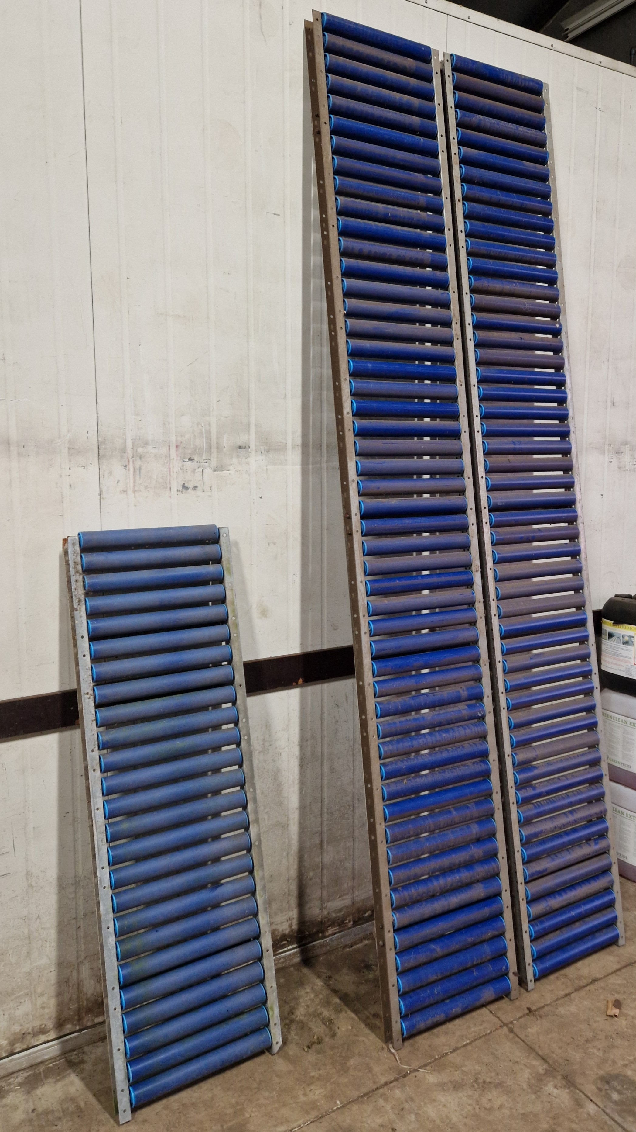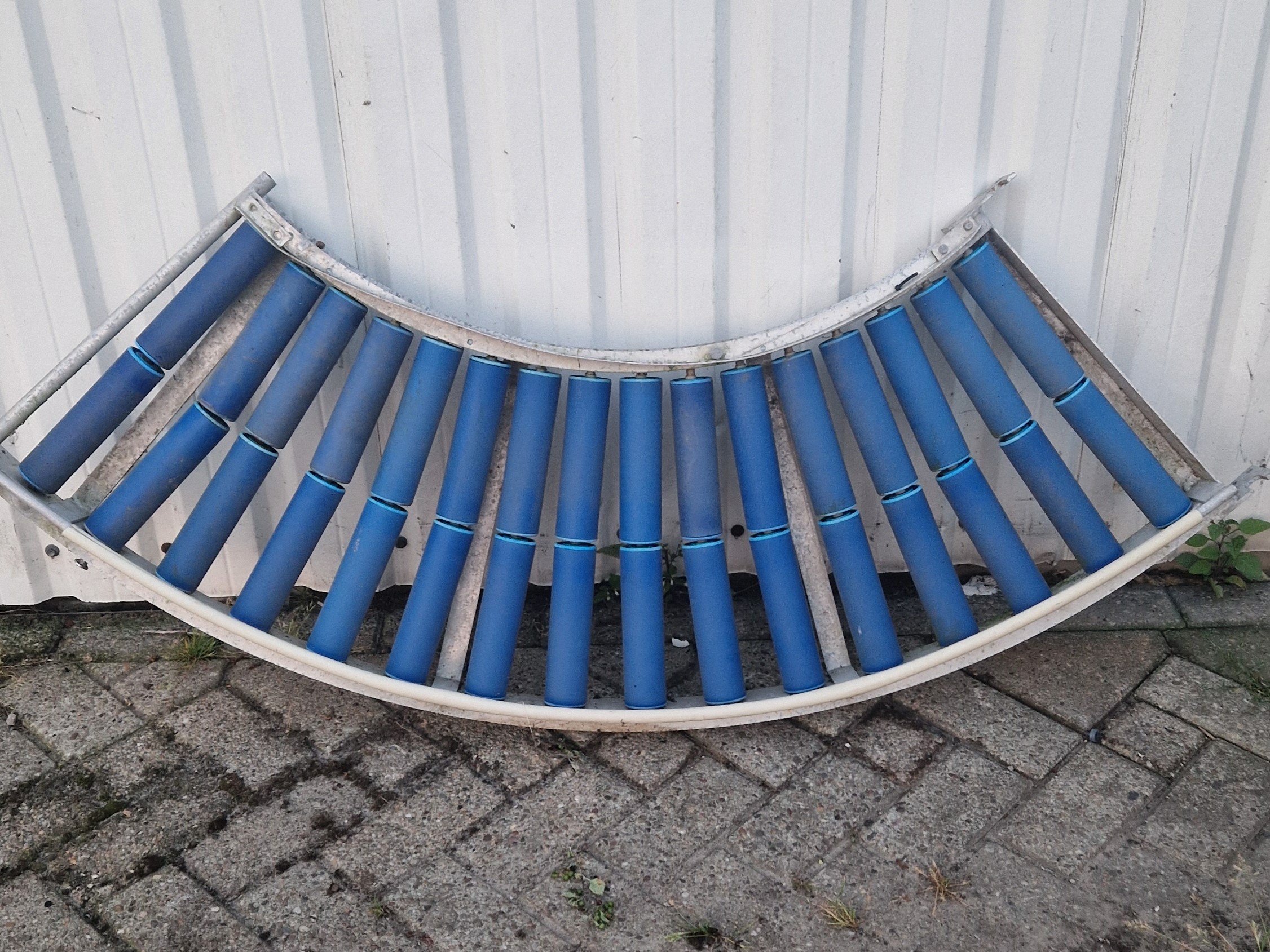 Rollenbanen Rolleon + steunen verstelbaar (8x) Rollengte 40cm. Baanlengte : 2x300cm + 1x200cm + 1x150cm + 1x bocht van 90 graden / radius 1030mm Roldiameter: 50mm Hart op hart rollen: 60mm Lagering: RVS kogellagers As diameter: 8mm