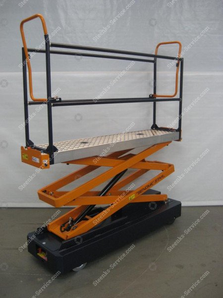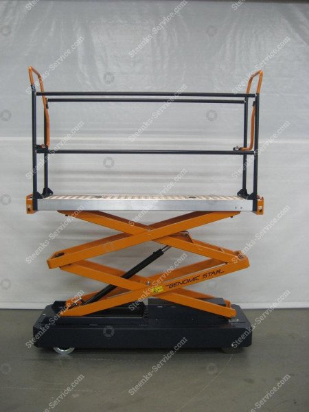 Buisrailwagen Benomic 2-schaar met 2x bediening in plateau, Berg(BP696), spoormaat 425mm, 4x op voorraad Referentie: BP696 Spoormaat: 425-51 mm. Minimale hoogte: 53 cm. Maximale hoogte: 300 cm. Type schaarplateau: dubbel hydraulisch * snelheid elektrisch regelbaar van 0-60 mtr. / min. * met 24 volt 110 Ah tractie-accu * met accu-indicatie-meter * met scheefstandsmelder * met 4x automatische opheffer * dubbele bediening in het plateau met 2 voetschakelaars, potmeterbediening aan 1 kant van het plateau * met stalen aandrijfrol en nylon brede flenzen * met brede veiligheidsreling geschikt voor schuifrek * hefvermogen 250 kg. Steenks Service staat voor: - Groot assortiment nieuwe en gebruikte machines - Service, onderhoud en reparaties - 40 jaar ervaring - Eigen onderdelenmagazijn - Service op locatie Levering: Nieuwe en gebruikte machines binnen Nederland GRATIS GELEVERD! Vraag voor verzending van onderdelen en accessoires onze scherpe tarieven op. Garantie: Op al onze nieuwe machines krijgt u 1 jaar garantie. Op al onze gebruikte machines krijgt u 3 maanden garantie. Op alle gebruikte accu’s krijgt u het 1e jaar 50% en het 2e jaar 25% garantie. Kijk voor meer nieuwe en gebruikte machines op onze website: www.steenks-service.nl of bel +31 (0)174-510266.