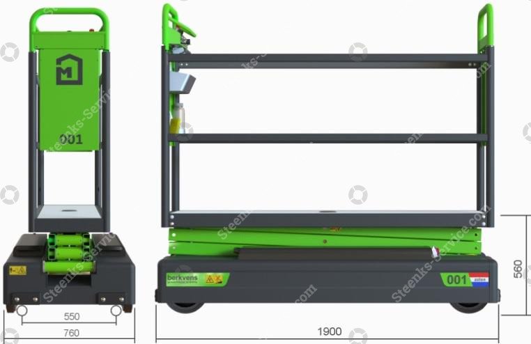 Buisrailwagen GL5000-D Berkvens (BV0000048) UIT VOORRAAD LEVERBAAR! Referentie: BV0000048 Minimale hoogte: 57 cm Maximale hoogte: 500 cm Schaarplatform: 3 Dubbel hydraulisch * buisrailwagen beschikbaar vanaf spoormaat 550 mm. * snelheid elektronisch regelbaar: op de buisrail 0-65 m/min. en high speed knop 95m/min. * met 24 Volt 118 Ah-5h/ 157 Ah-20h vol tractie accu * met accu-indicatie-meter * met uren teller in bedieningspaneel * met scheefstandsmelder * buisdetectie en platformlast beveiliging * met hoofstroom relais om lekspanning te voorkomen * geheel voorzien van 2 lagen poedercoat en vooraf volledig gezandstraald * voor en achter voorzien van speciale stootblokken * met AC-rijmotor met een geheel gesloten/ kettingloze aandrijving * met gietstalen aandrijf en meelooprollen op de buisrail * met 40 mm. brede rubberbetonpad wielen * met RVS waterdicht voetpedaal * met gas/remfunctie schakelaar ten behoeve van voetpedaal * met opbergbakje aan bedieningspaneel * geheel volgens de laatste Europese normen, wet en regelgeving Steenks Service staat voor: - Groot assortiment nieuwe en gebruikte machines - Service, onderhoud en reparaties - 40 jaar ervaring - Eigen onderdelenmagazijn - Service op locatie Levering: Nieuwe en gebruikte machines binnen Nederland GRATIS GELEVERD! Vraag voor verzending van onderdelen en accessoires onze scherpe tarieven op. Garantie: Op al onze nieuwe machines krijgt u 1 jaar garantie. Op al onze gebruikte machines krijgt u 3 maanden garantie. Op alle gebruikte accu’s krijgt u het 1e jaar 50% en het 2e jaar 25% garantie. Kijk voor meer nieuwe en gebruikte machines op onze website: www.steenks-service.nl of bel +31 (0)174-510266.