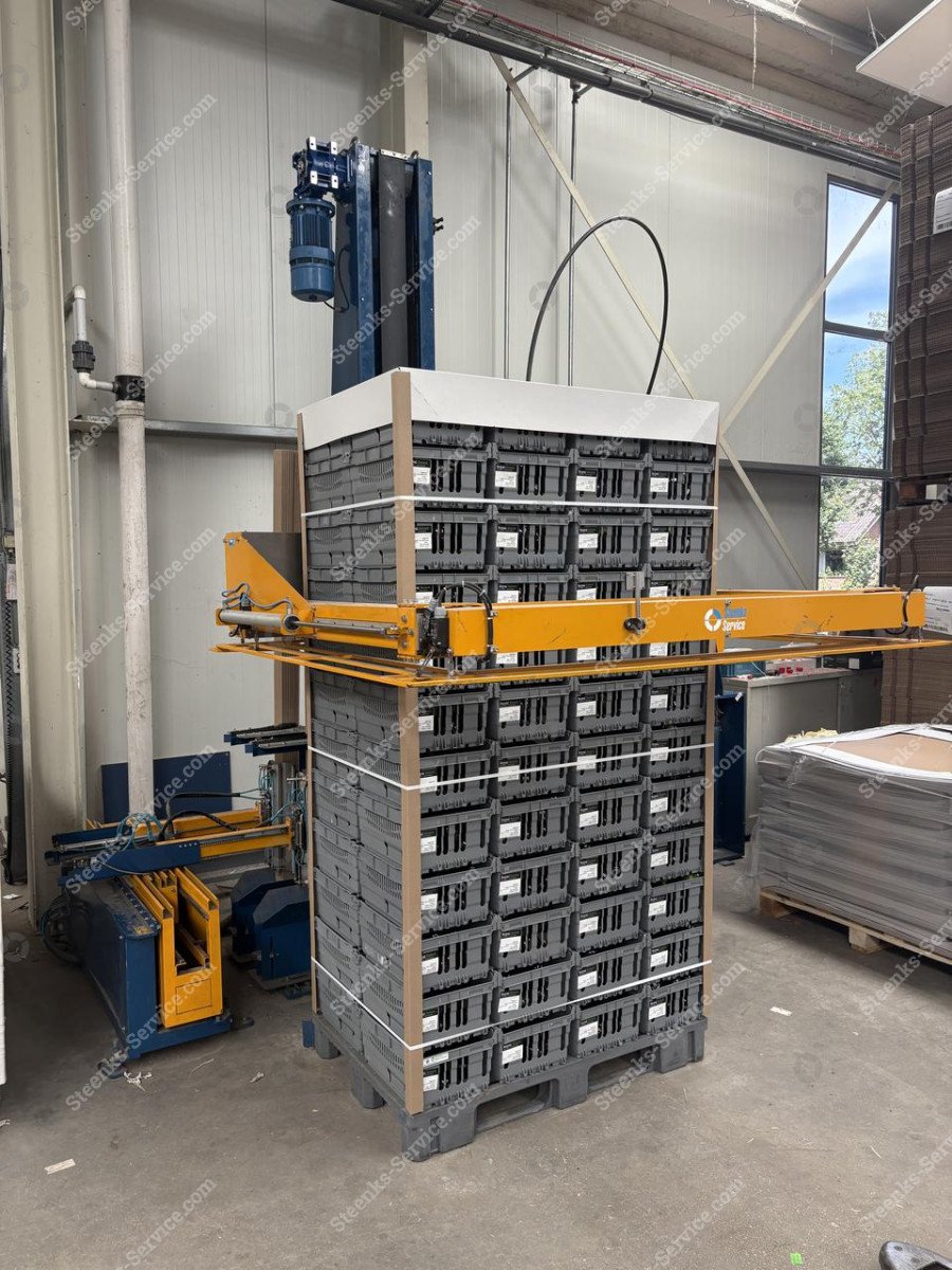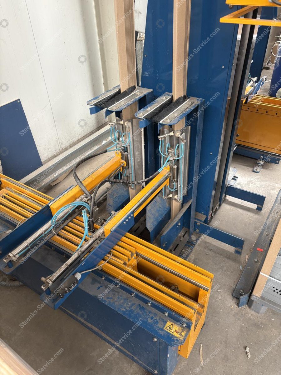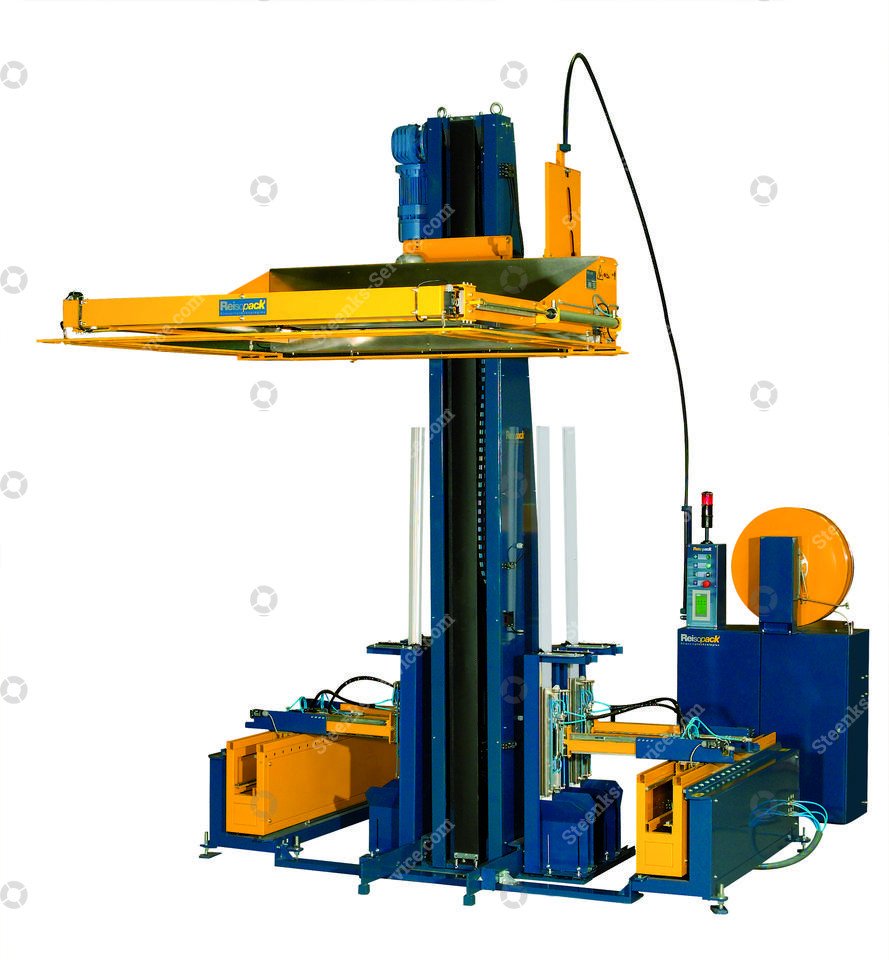 Reisopack 2904 omsnoeringsmachine (gebruikt) VP101 Omsnoeringsmachine (gebruikt) VP101 Ref: VP101 Merk: Reisopack Type: 2904 volautomatisch horizontaal omsnoeren Omsnoeringsband Polyester Omsnoeringsbandbreedte: 12 mm. Omsnoeringsbanddikte: 0,55 mm. Toepassing: los of in verwerkingslijn (Bij een losse toepassing is een aanrijhoek voor de pallets noodzakelijk en dient de belading op de pallet perfect recht aangeleverd te worden). * PLC: standaard Omron * met touchscreen * met mechanische spanningsregelaar * eigen gewicht: 1750 kg * voltage: 400 v 50/60 Hz 3 Phase * elektrisch verbruik: 2kVA (2000 Watt) * productie snelheid: 3 banden en hoeklatten in ca. 72 sec. (exclusief transport/in-uitvoer) * te omsnoeren pallets: (belading gelijk aan pallet) ( 1.20 x 1.00 / 1.20 x 0.80 mtr.) Let op: de 1.20 maat van de pallet moet altijd in de breedte van de machine aangeboden worden (hoeklatarmen schuiven dus 0.80 of 1.00 mtr. uit) De machine vereist dus dat de lange zijde van de pallet (1.20) naar de kolom geplaatst wordt. * aantal delen: 4 * afmetingen (pallets tijdens transport) LxBxH: 357 x 202 x 167 cm. / 120 x 67 x 187 cm. / 168 x 168 x 120 cm. * minimale pallethoogte met belading voor omsnoeren met hoeklatten is 1130 mm. * minimale bindhoogte: 145 mm. (exclusief eventuele verhogingen van derden) * maximale bindhoogte: 2700 mm. (exclusief eventuele verhogingen van derden) * geschikt voor hoeklatten 40x40 / 45x45 (Deze dienen exact recht te zijn en van de juiste kwaliteit) * voorraadmagazijn voor hoeklatten heeft een beschikbare buffer per magazijn van ca. 40 hoeklatten (Uitgaand van de standaard dikte van ca. 2,5 mm.) Steenks Service staat voor: - Groot assortiment nieuwe en gebruikte machines - Service, onderhoud en reparaties - 40 jaar ervaring - Eigen onderdelenmagazijn - Service op locatie Levering: Nieuwe en gebruikte machines binnen Nederland GRATIS GELEVERD! Vraag voor verzending van onderdelen en accessoires onze scherpe tarieven op. Garantie: Op al onze nieuwe machines krijgt u 1 jaar garantie. Op al onze gebruikte machines krijgt u 3 maanden garantie. Op alle gebruikte accu’s krijgt u het 1e jaar 50% en het 2e jaar 25% garantie. Kijk voor meer nieuwe en gebruikte machines op onze website: www.steenks-service.nl of bel +31 (0)174-510266.