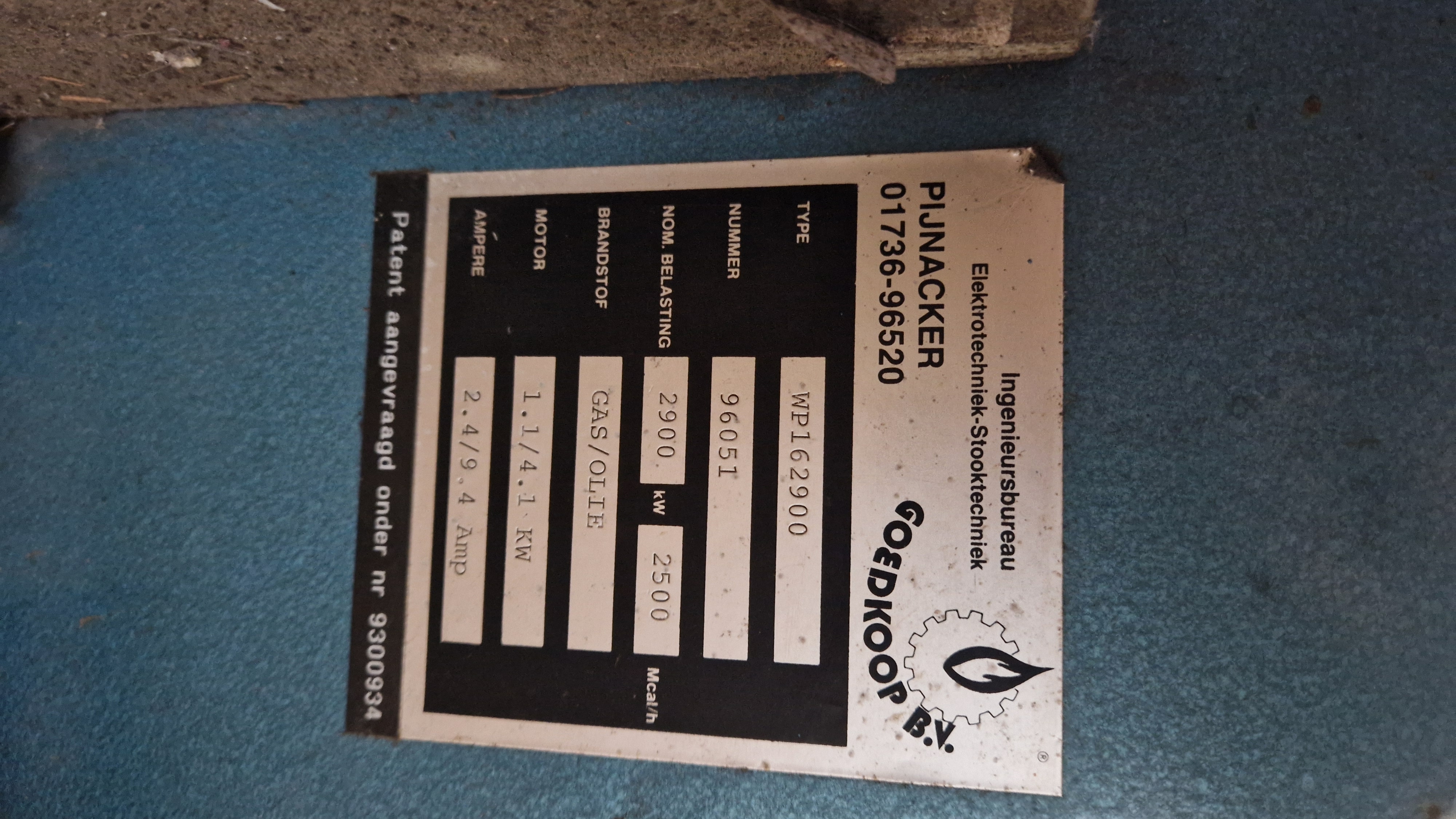 Brander Goedkoop type: WP162900 Gas/olie Nom.belasting 2900kW - 2500Mcal/h Motor 1,1/4,1 KW Ampere 2,4 / 9,4 Amp